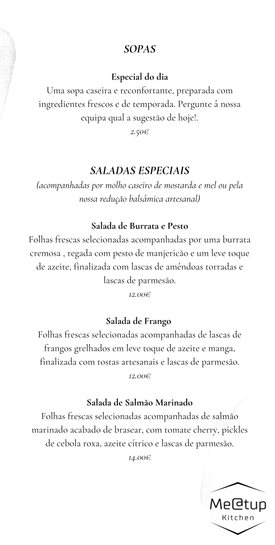 Welcome to Meetup Kitchen, a culinary gem located in Sra. da Hora, Portugal. This vibrant eatery specializes in creating a shared gastronomic experience, bringing people together through a thoughtfully curated menu. The highlight of their offerings includes the Salada de Burrata e Pesto, featuring fresh greens, creamy burrata, and a drizzle of basil pesto, topped with toasted almond slivers and Parmesan shavings, all for just €12.00.